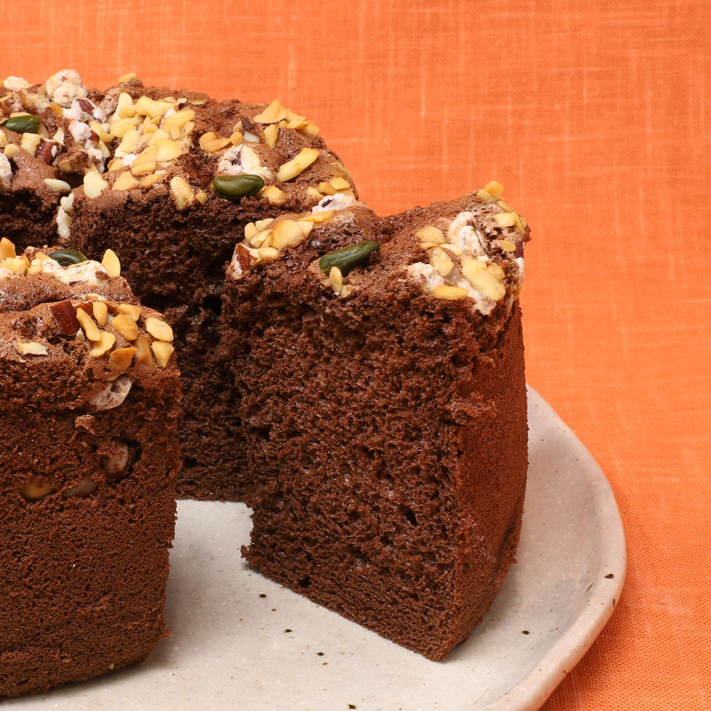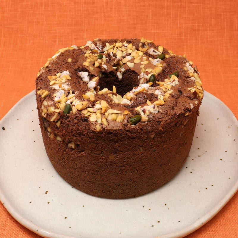 チョコ風味のシフォンにマカダミアナッツやピスタチオ、スイートチョコチップをのせて焼き上げました。